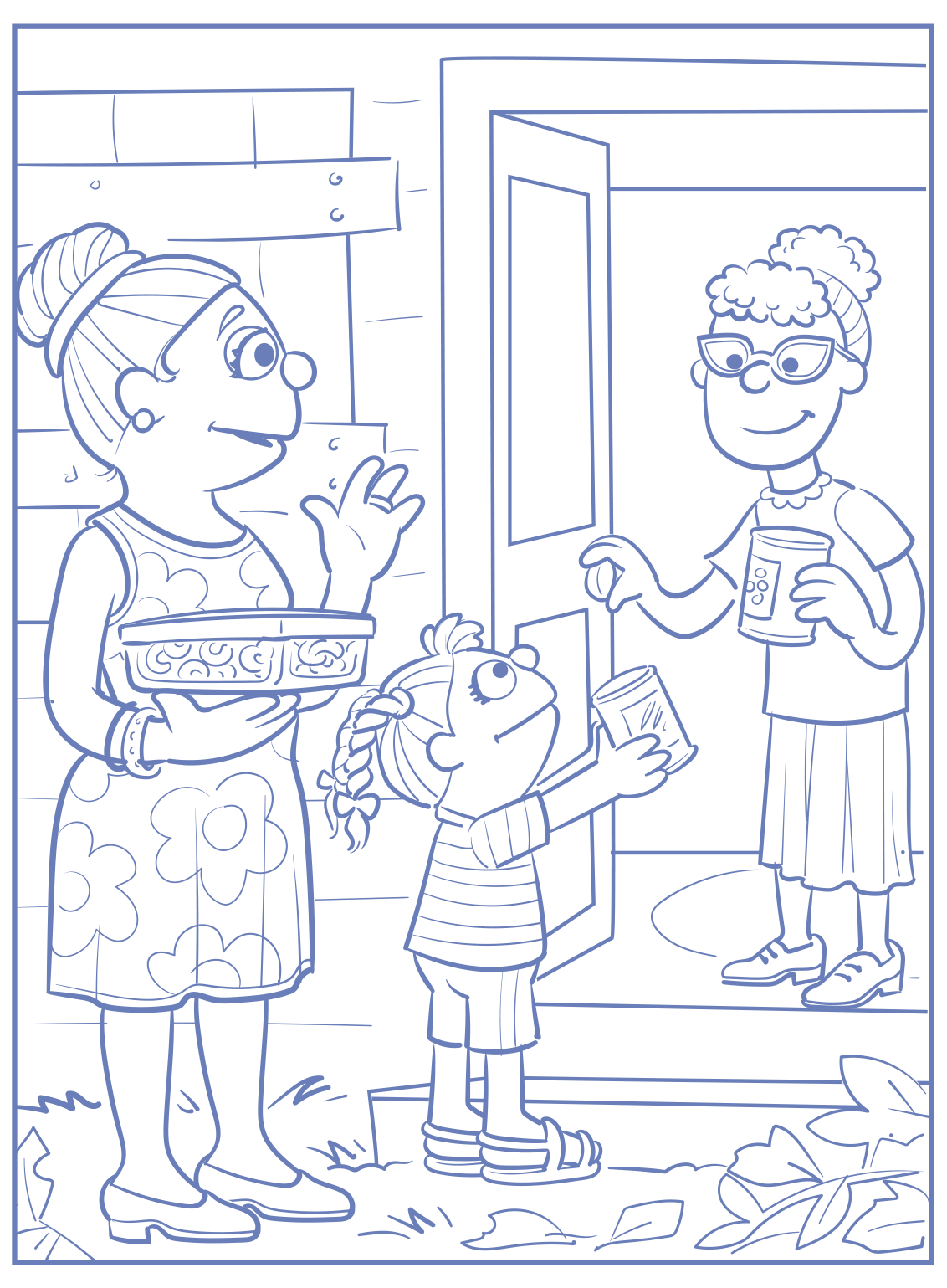 Neighbors Helping Neighbors: Every neighbor can be a helper! Sharing supplies, making community meals, and checking in on each other helps the whole community through hard times.