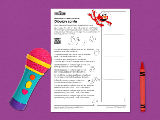 Hablen sobre lo que Elmo podría ver y observar de cerca en la acera. Invite a los niños a dibujar lo que creen que Elmo podría ver, como hormigas, hojas caídas, palos, bellotas, la maleza que crece entre las grietas de la acera o cualquier otra cosa que los niños se puedan imaginar.