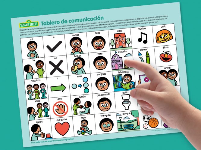 Nuestro primer tablero de comunicación presenta el vocabulario básico y los amigos de Sesame Street.