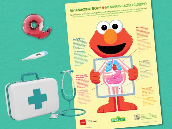 Invite children to examine Elmo’s heart, lungs, bones, muscles, and digestive system… and talk about how moving our bodies and eating well help us stay healthy. What questions do children have about what’s inside our bodies and how they work? Look up the answers online together.